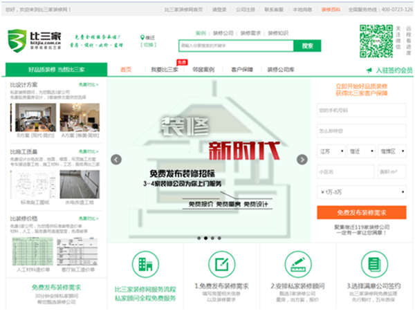 比三家裝修網(wǎng)于2015年10月份落戶蘇宿電子商務(wù)產(chǎn)業(yè)園,該裝修網(wǎng)定位于“互聯(lián)網(wǎng)+”大眾創(chuàng)業(yè)平臺(tái),是一家扎根于三線城市,以“中介生意”模式幫助傳統(tǒng)的裝修行業(yè)的公司利用互聯(lián)網(wǎng)接到更多的訂單,幫助用戶找到合適的裝修公司。網(wǎng)站通過(guò)好品質(zhì)裝修,比設(shè)計(jì)方案、比施工質(zhì)量、比裝修價(jià)格,為用戶提供符合比三家裝修網(wǎng)標(biāo)準(zhǔn)的服務(wù)。