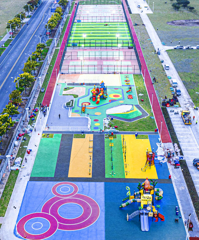 該項目所處位置原為一處待開發(fā)地塊,園區(qū)根據(jù)居民需求規(guī)劃建設健身跑道、全齡段健身區(qū)、綜合兒童活動區(qū)、平地輪滑場、廣場舞片區(qū)和各類球場(其中羽毛球四組、網(wǎng)球場一組,7人制籠式足球場一組、籠式籃球場四組),同步建設公廁、停車場等配套設施。