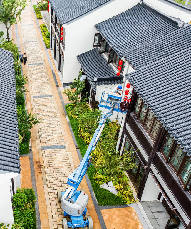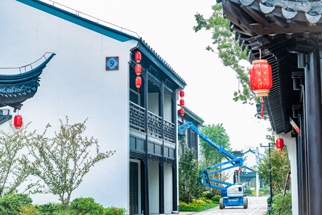 2023年9月25日,蘇宿工業(yè)園區(qū)蘇州街,工人們正在掛燈籠,喜迎中秋、國慶雙節(jié)到來。大紅燈籠與白墻青瓦綠樹相映成趣,成為一道靚麗的風(fēng)景線,營造了歡樂、喜慶、祥和的節(jié)日氛圍。