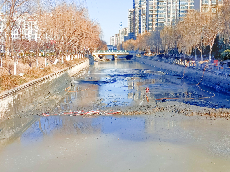 園區(qū)利民河全長(zhǎng)1.1公里、寬20米,為區(qū)內(nèi)景觀(guān)河。經(jīng)前期摸排,河道內(nèi)淤泥沉積較多,影響河道自?xún)裟芰?。城發(fā)公司克服冬季氣溫低、斷面長(zhǎng)、施工難等不利因素,采用泥漿泵配合高壓水槍射水,管道封閉運(yùn)輸?shù)氖┕し椒?,清理淤泥約8500立方米,高效完成河道清淤工作。