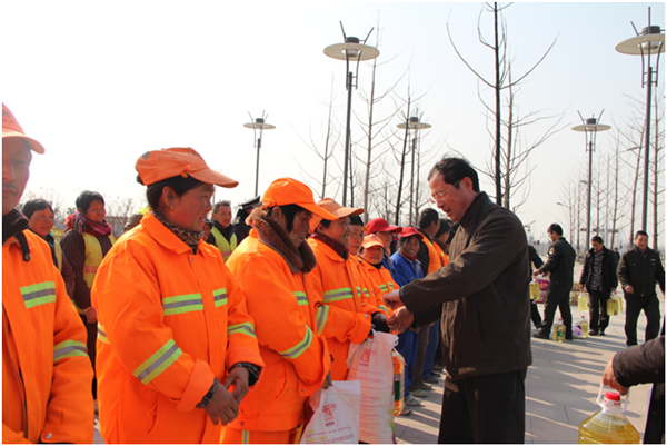 在慰問現(xiàn)場,周原與城市維護(hù)工人親切握手,向他們送上了米、面、油等慰問品,感謝他們一直以來為蘇宿園區(qū)城市維護(hù)工作付出的辛勤勞動(dòng),并衷心祝愿他們春節(jié)快樂、身體健康,闔家幸福。