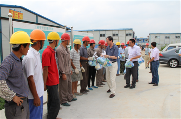 8月11日上午,園區(qū)黨工委委員、規(guī)劃建設(shè)局局長(zhǎng)周原帶隊(duì)來(lái)到夢(mèng)家園、許莊變、2014年市政二標(biāo)等項(xiàng)目工地,檢查防暑降溫措施落實(shí)情況,并慰問(wèn)奮戰(zhàn)在高溫一線的建筑工人。