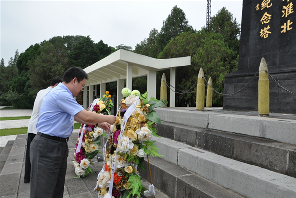 雨后的彭雪楓將軍墓園青松蒼郁,翠柏蔥蘢,綠草如茵,矗立在墓園中心廣場(chǎng)的國(guó)民革命軍新編第四軍淮北解放區(qū)抗日陣亡烈士紀(jì)念塔更顯莊嚴(yán)肅穆,方文浜、周原緩步向前,向紀(jì)念塔敬獻(xiàn)花籃,園區(qū)參加活動(dòng)全體黨員干部向紀(jì)念塔三鞠躬。